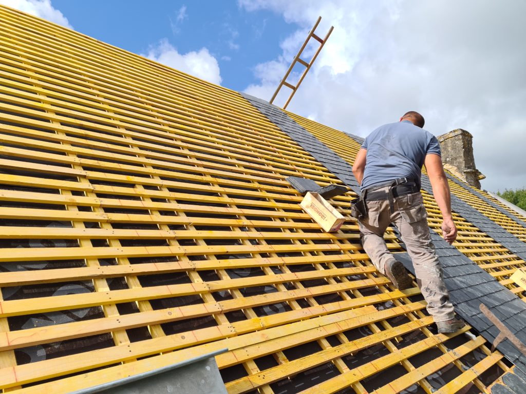 Enfin, nos artisans s’attellent à la pose des ardoises naturelles ou des tuiles, en veillant à utiliser des crochets appropriés pour garantir une fixation solide et durable.